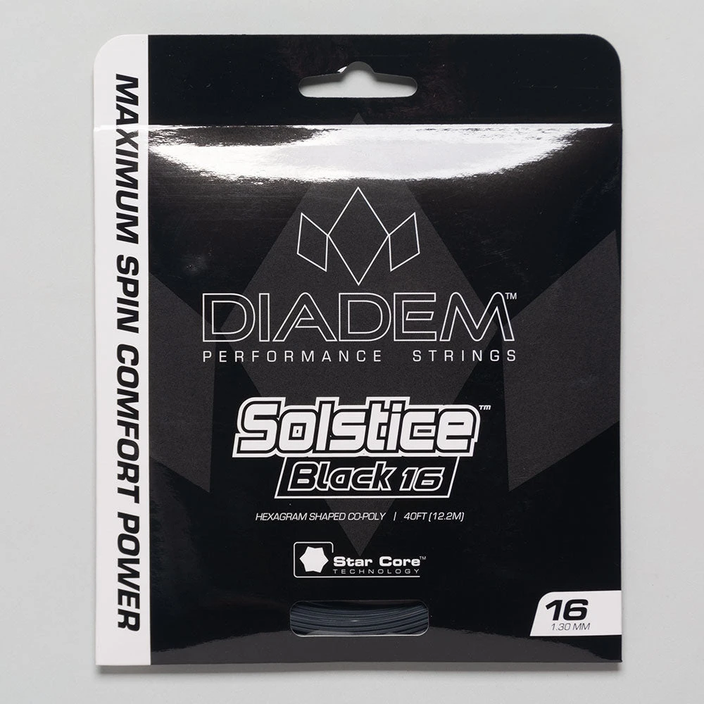 The Diadem Solstice Black 16 1.30 tennis string is aggressively shaped to unleash massive spin. This co-polyester string offers a softer alternative than the Solstice with a low-friction surface and maximum bite on the ball. Star Core Technology uses a six-pointed geometric cross section that equally distributes contact between the strings, reducing friction while amplifying snapback. Simultaneously, the star shape creates a larger surface area to add more bite on the ball. If you want to swing with vicious spin, try the Diadem Solstice Black 16 1.30!